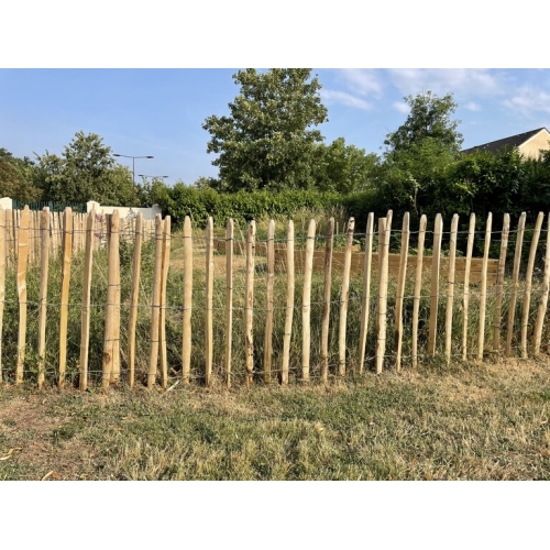 La pose se fait sur des piquets en chataignier espacés de 1.50 m à 2.00 m, prévoir une jambe de force au départ, à la fin et dans les angles.