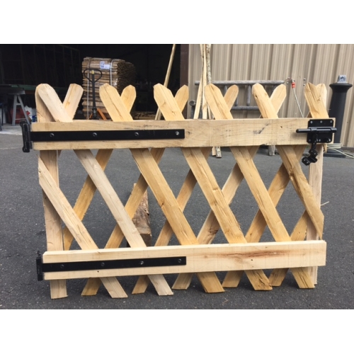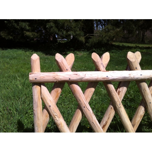 La clôture croisillon est constituée d’échalas demi ronds de châtaignier écorcés et pointés assemblés en maille losange avec des agrafes galvanisées sur deux traverses (sauf hauteur 0.50 m, une traverse).